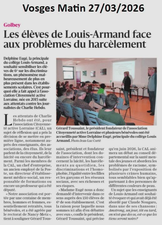 Citoyenneté Active Lorraine au collège de Golbey Mardi 24 mars Programme Matinée de 10h à 11h Pour 4 groupes d'une vingtaine d'élèves de 6éme Présentation de l'évolution humaine par Jean Louis REYNET de 11h à 12h Reprise avec chaque groupe à partir de la présentation sur le thème du RACISME en forme de débats mouvants Les collégiens ont été attentifs à la présentation (1 heure) ainsi qu'aux débats mais avec un temps un peu court. (30 minutes) Après-midi de 13h à 14h Pour 3 groupes d'une vingtaine d'élèves de 6éme Présentation de l'évolution humaine par Jean Louis REYNET 14h à 15h Reprise avec chaque groupe à partir de la présentation sur le thème du RACISME en forme de débats mouvants. Les collégiens sont moins attentifs à la présentation, ainsi qu'aux débats mais avec un temps un peu court. (30 minutes) Expériences globalement positives mais demandant pour la conférence, une attention d'une bonne heure, plus oppérante en matinée pour des 6éme et "l'espace classe" peu adapté aux débats mouvants. Merci pour l'accueil du collège et la participation des collégiens |